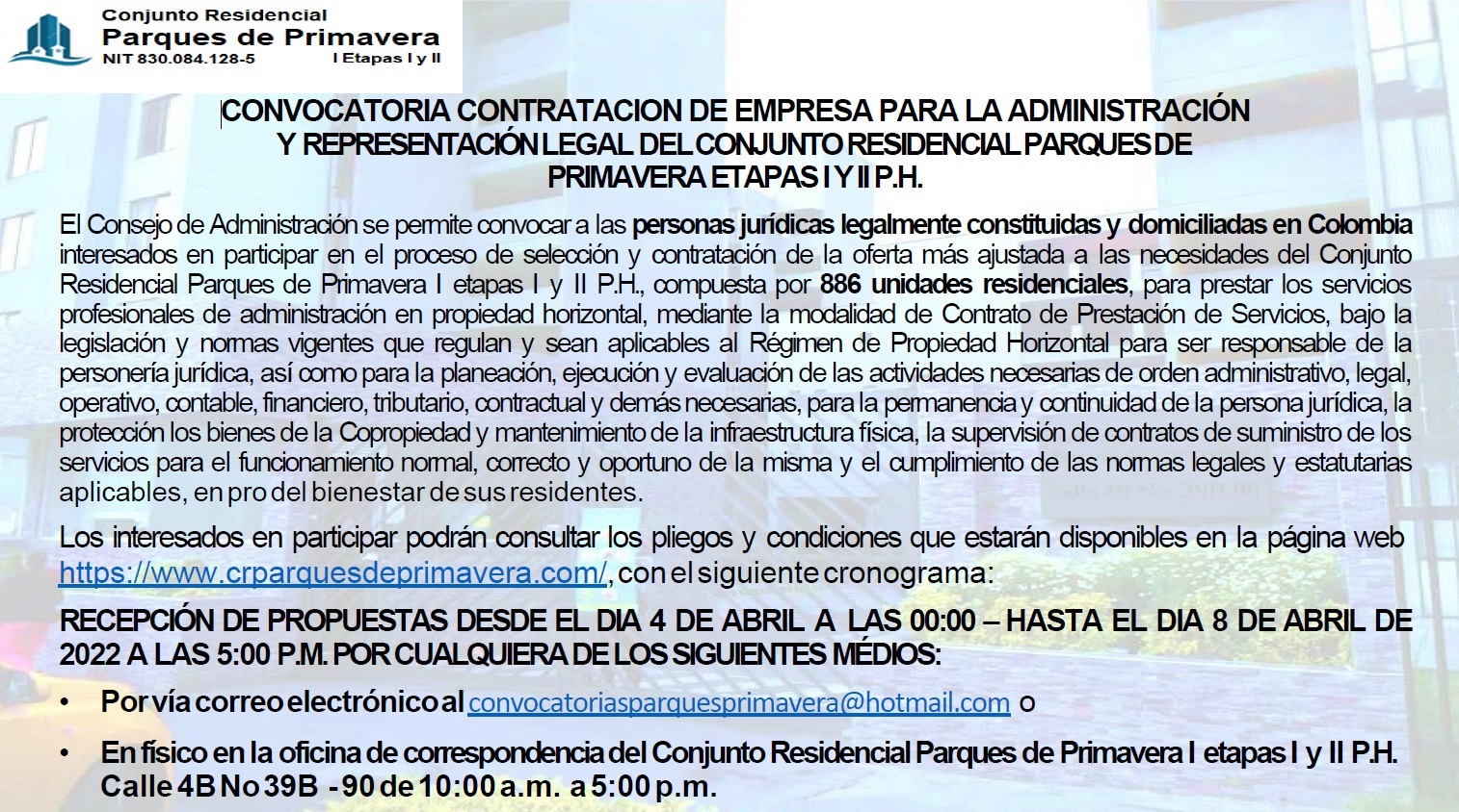 El Consejo de Administración se permite convocar a las personas jurídicas legalmente constituidas y domiciliadas en Colombia interesados en participar en el proceso de selección y contratación de la oferta más ajustada a las necesidades del Conjunto Residencial Parques de Primavera I etapas I y II P.H.,compuesta por 886 unidades residenciales, para prestar los servicios profesionales de administración en propiedad horizontal.